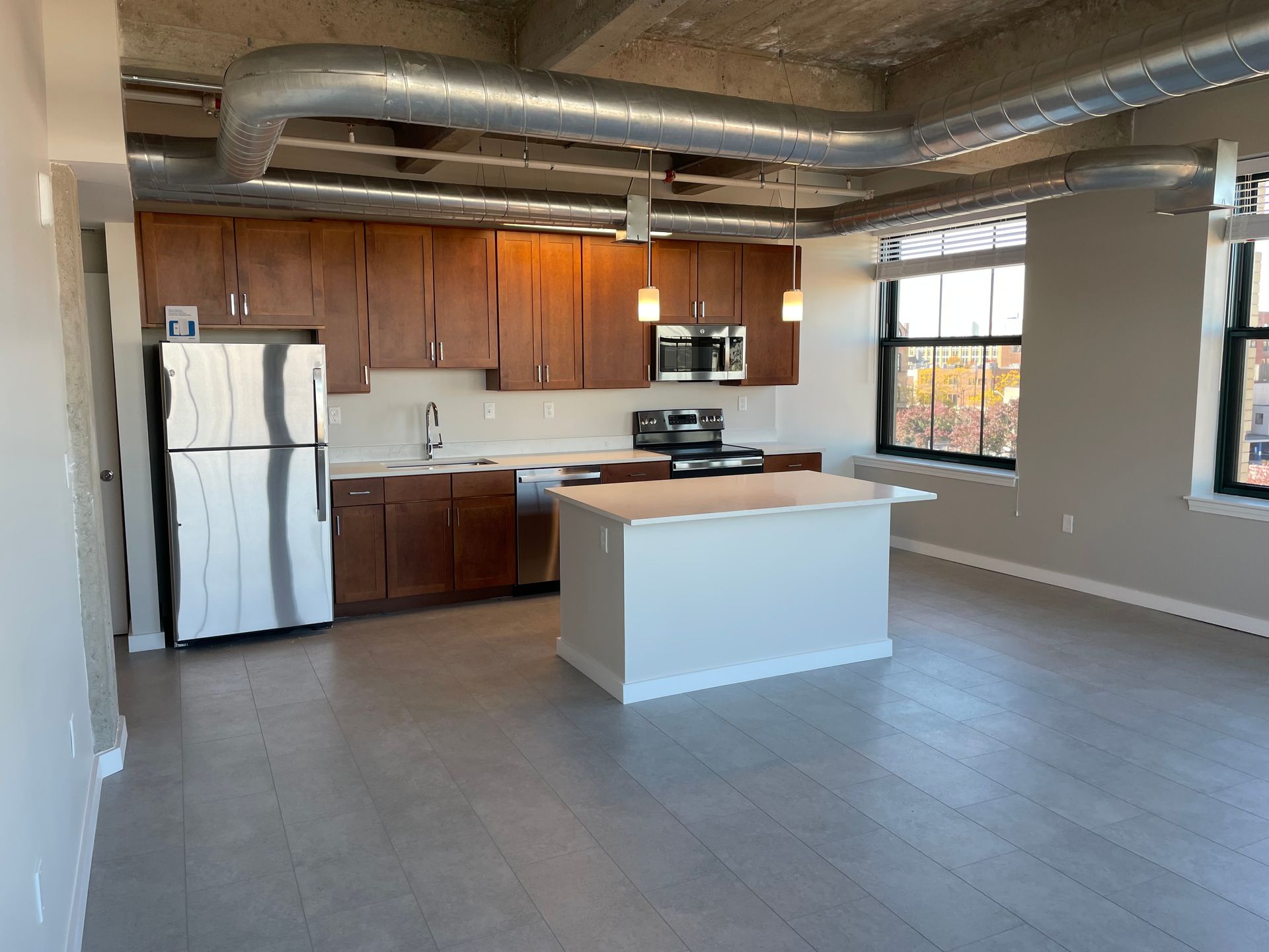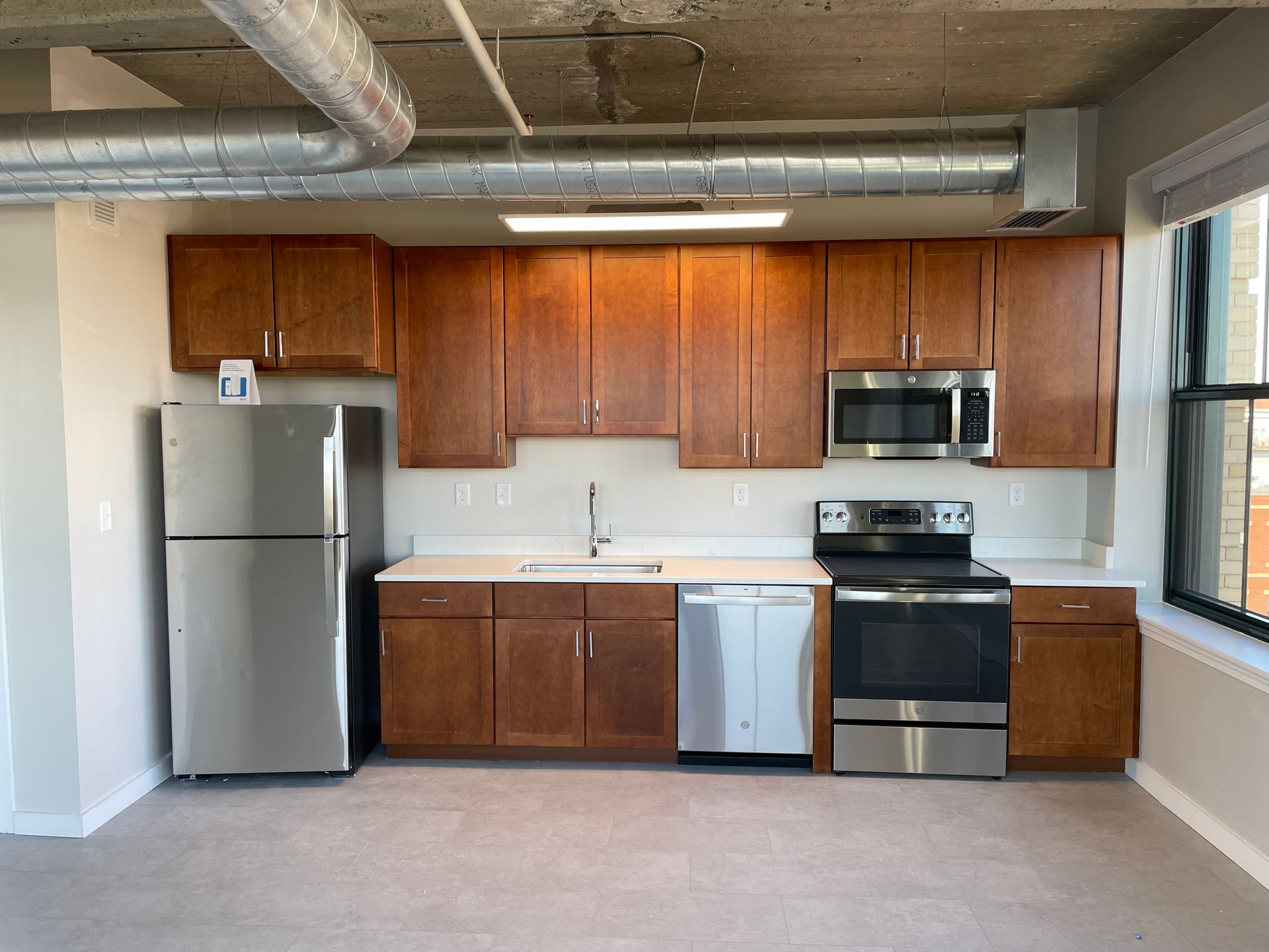 Each apartment in the historic building has its own personality with its expansive high ceilings that are not always available in traditional apartment complexes. Apartments also feature exposed concrete columns and ceilings, and views of downtown through historic windows. The elegant ambiance of the apartments blends seamlessly with modern features, such as stainless-steel appliances, quartz countertops, an in-unit stackable washer and dryer, a state-of-the-art heating and air conditioning system, and a video intercom.